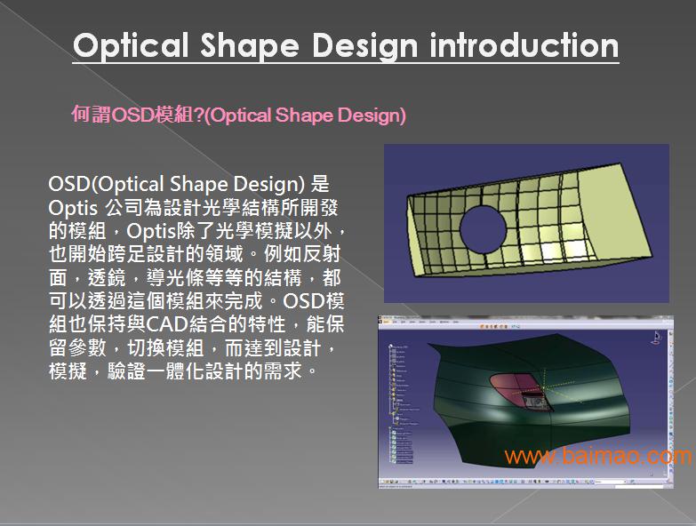 6.OSD(Optical Shape Design) 是 Optis 公司為設(shè)計光學(xué)結(jié)構(gòu)所開發(fā)的模組,Optis除了光學(xué)模擬以外, 也開始跨足設(shè)計的領(lǐng)域。例如反射面,透鏡,導(dǎo)光條等等的結(jié)構(gòu),都可以透過這個模組來完成。OSD模組也保持與CAD結(jié)合的特性,能保留參數(shù),切換模組.
