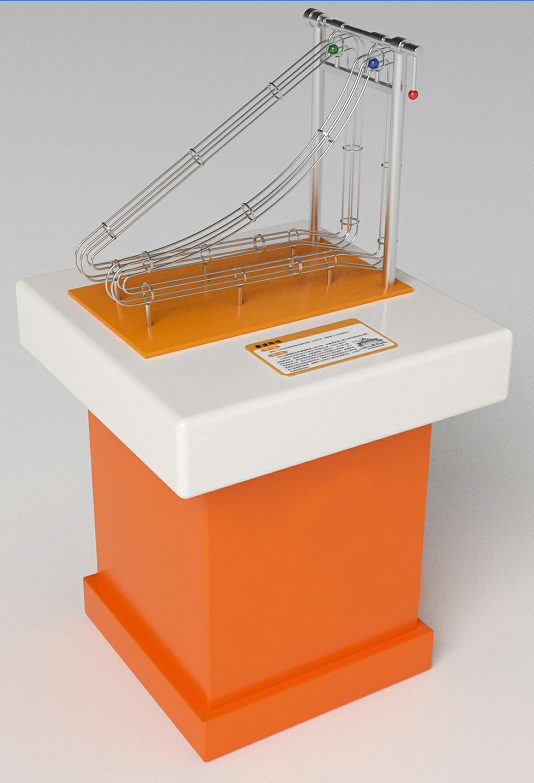 三、功能概述:展品由兩條軌道、兩個半徑和質量相等的小球和操作桿組成。兩條軌道的起點和終點高度相同,其中一條為直線軌道,另一條為曲線軌道。把兩個小球分別放到起點位置,拉動操作桿,兩個小球同時滾落,無論嘗試多少次,曲線軌道上的小球總是最先到達終點。為什么沿著較長軌道滾落的小球用的時間最短呢?小球到達終點的先后不僅取決于軌道的長度,還與小球的下滑速度有關。實際上,曲線軌道是一條最速降線,在小球下降的初始階段,通過較陡的軌道使小球盡快獲得較大的速度;再充分利用較大速度走完平坦的曲線。因此,與其它軌道相比,最速降線上滾落的小球總是可以最先到達終點。最速降線在工程中應用廣泛。我國古代建筑中“大屋頂”房子上的曲線就是最速降線,降落在屋頂上的雨水能夠以最快的速度流走。