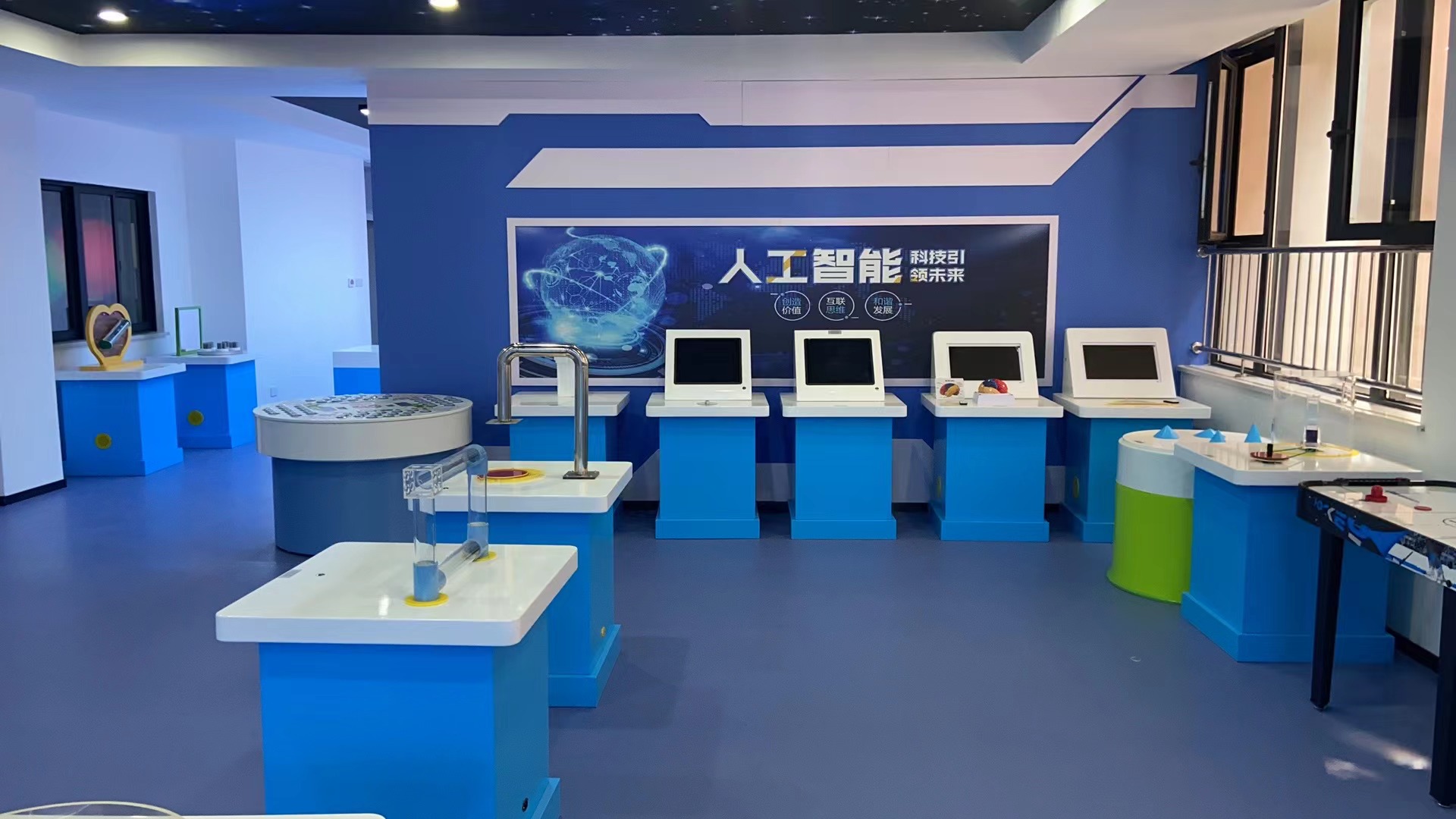 二、科技創新實驗室的建設內容科技創新實驗室由人工智能與機器人系列、VR體驗系列、航模系列、新能源與新材料系列、創客系列和科技智慧墻等六大部分儀器組成。這些儀器集科學性、知識性、趣味性、操作性于一體,將光的反射、聲的傳播、力