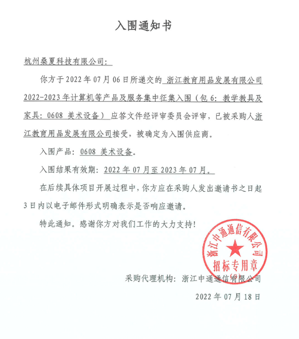 2022年7月18日,杭州桑夏科技有限公司喜獲“入圍通知書”。入圍項(xiàng)目是“浙江教育用品發(fā)展有限公司2022-2023年計(jì)算機(jī)等產(chǎn)品及服務(wù)集中征集入圍”中的美術(shù)設(shè)備。
