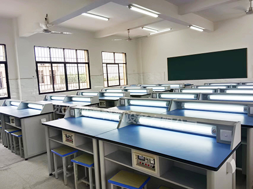 廣視通為大余縣新城中學規劃設計了物理綜合實驗室,化學實驗室,生物綜合實驗室,準備室等場室,助力學校實驗室標準化建設。廣視通實驗室整體設計以教學為主,合理地利用空間布局,為日常理化生實驗室教學、實驗操作考評、公開課等提供了必要條件,有利于激發學生學習興趣,培養學生的動手能力和創新意識。