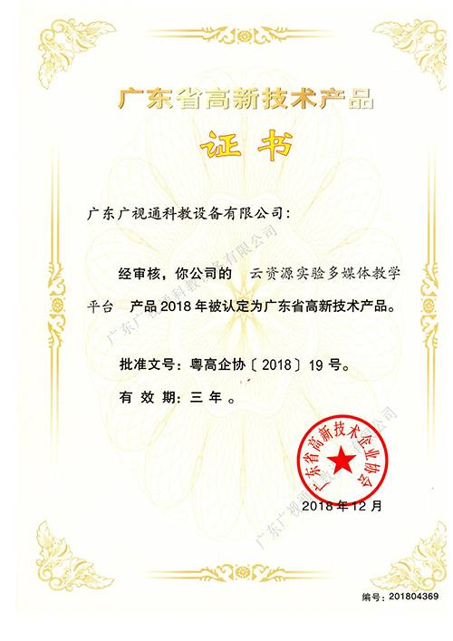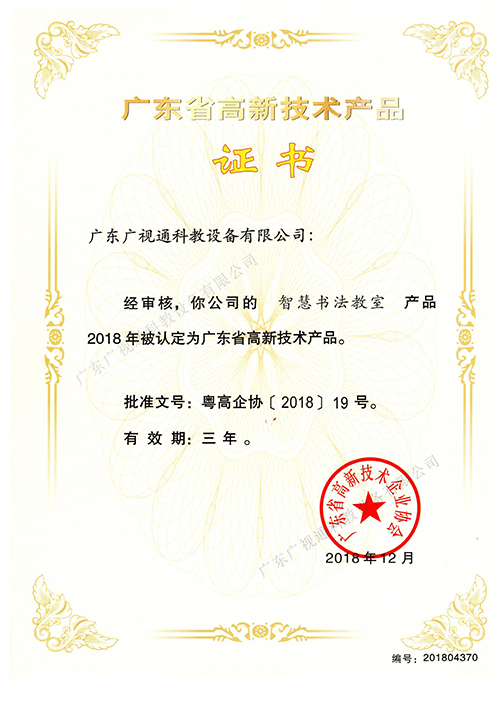 近日,經廣東省高新技術企業協會嚴格審核,廣東廣視通科教設備有限公司的智慧書法教室、云資源多媒體教學平臺、創新智慧實驗室、數字化地理實驗室四項自主知識產權產品被認定為廣東省高新技術產品,是對公司自主研發、創新能力的充分肯定。