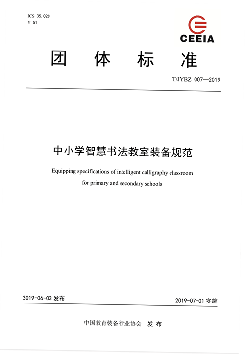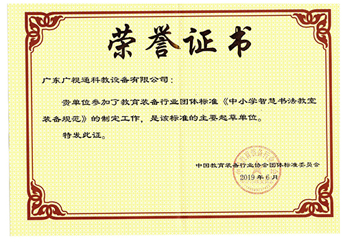 近日,中國教育裝備行業協會團體標準委員會頒發了《中小學智慧書法教室裝備規范》起草制訂單位證書,廣東廣視通科教設備有限公司參加了本規范標準的制定工作,是該標準的主要起草單位。