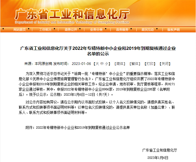 近日,廣東省工業和信息化廳發布了《關于2022年“專精特新”中小企業和2019年到期復核通過企業名單的公示》,廣視通成功入選,順利通過了2022年廣東省“專精特新”中小企業認定。