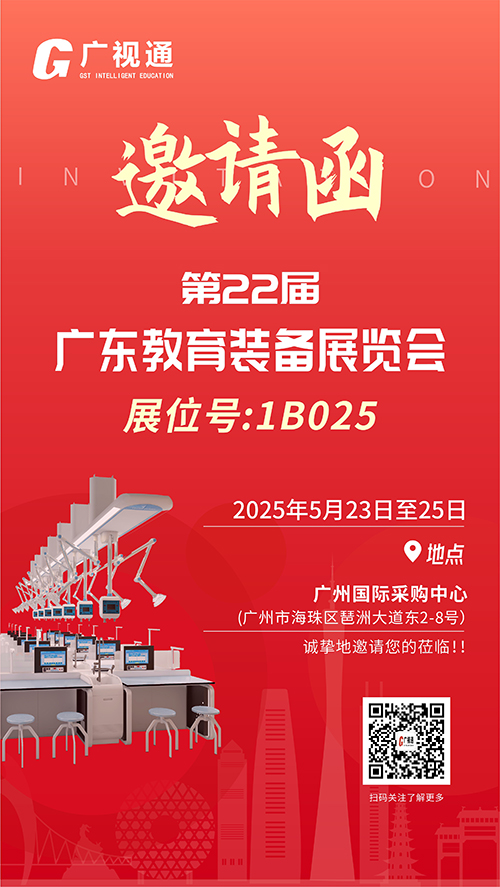5月23日至5月25日,第22屆廣東教育裝備展覽會將在廣州國際采購中心舉辦。廣視通將攜智能理化生實驗室全系列產品、中學AI教考實驗室、實驗仿真與教學系統、實驗室危化品管理系統等智慧教育產品在1B025展位期待您的蒞臨!