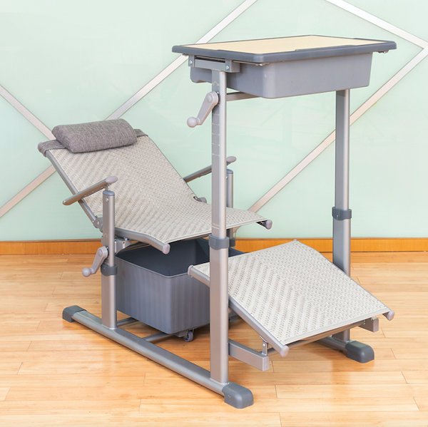 3、課斗規格:360mm*450mm*100mm±3mm,PP塑料一次成型,課斗可水平前后活動80mm,課桌底下前部設置藤質躺板。