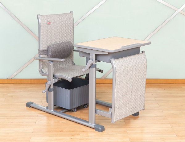 4、課椅規格及材料:460mm*380mm*(座椅面高420mm-460mm可手搖升降調節)±5mm,椅背可調最大傾斜度150°。座靠面料采用符合出口標準,沖擊100KG,靜壓180KG,60分鐘無損,抗紫外線不褪色,使用壽命8年以上的環保PE藤條。藤條規格為寬7.5mm±0.05mm*厚1.2mm±0.02mm,滕面邊沿采用PE材料包邊,尼龍線縫紉固定工藝。椅下設置370*330*190mm±3mm的PP材料的貯物箱,貯物箱底下前部設置雙滑輪,后部設置滑塊,與課椅下雙滑軌(ABS材質,規格315*30*20mm)的卡位裝置結構配合,貯物箱可前后自由限位滑動,可脫卸。