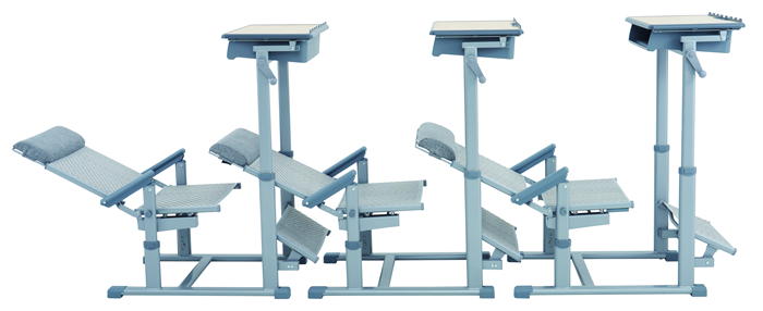 7、課桌椅午休模式:課桌通過單側手搖桿升高到午休高度,課椅靠背后仰,并打開PE藤質擱腳板,借助桌下和椅下空間,可在0.88米前后間距實現150度原位舒適躺休。