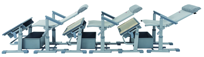 6、課桌椅午休模式:課桌通過兩側按鍵調節到最低高度,并將桌面向前下方折疊固定,課椅靠背向后調節,借助桌上和椅下空間,可在1米前后間距實現150度原位舒適躺休。