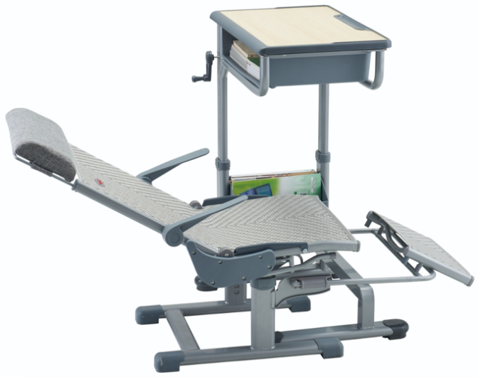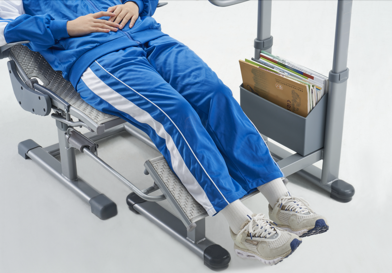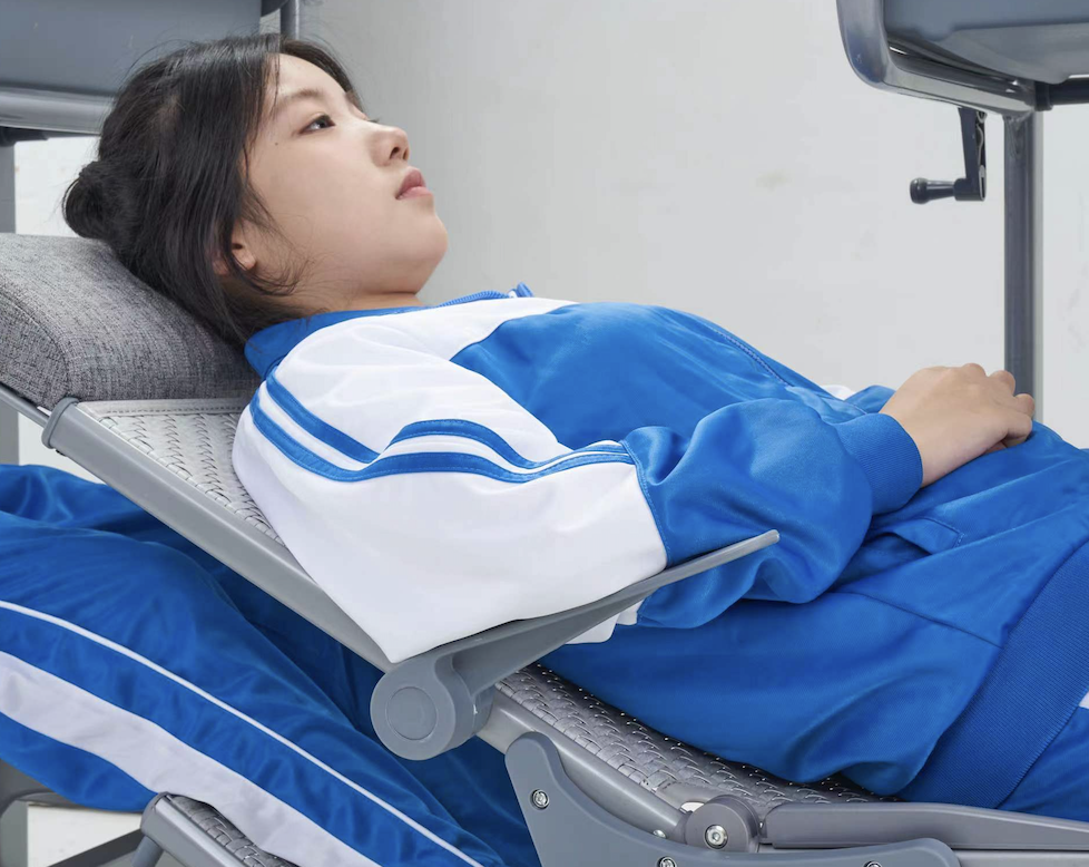產品在教室內擺放時,小學生可在90公分前后間距實現150度原位舒適躺休,中學生可以在1米前后間距實現150度原位舒適午休。而且從座椅轉換成躺椅形態時,也不需要向外擴展空間,滿足多人教室和小面積教室的現實改造。