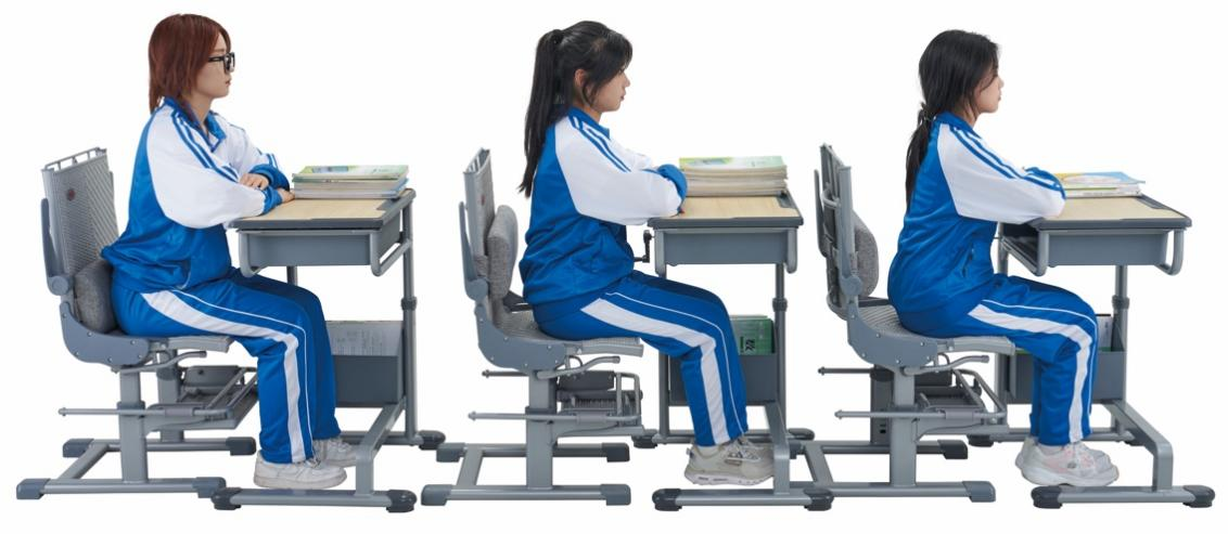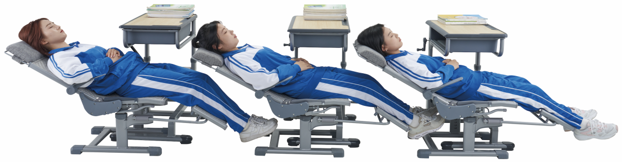 產品在研發時充分考慮到教室空間的利用率,將課椅椅腳進行延長保證穩固性,午休時將課椅向前移動,將桌面搖高到午休高度,充分利用課桌下方的可用空間和前位椅下的空間,并且讓平躺午休更加舒適安全。
