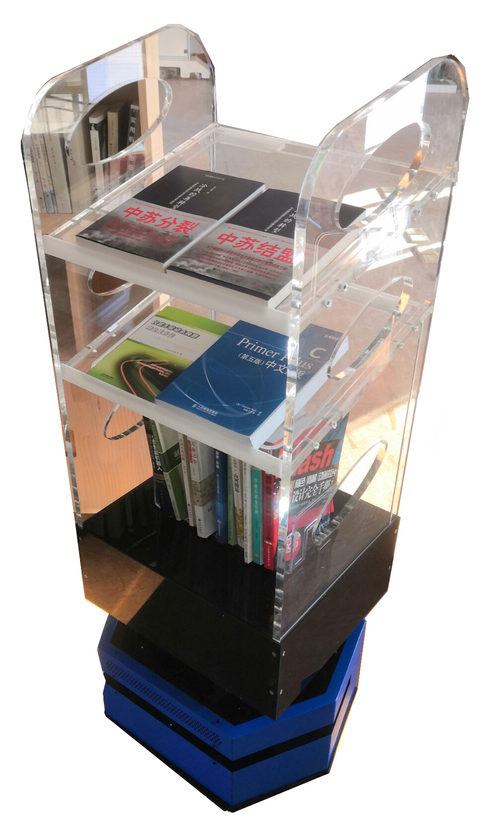 5、書架由進(jìn)口透明亞克力組成且堅(jiān)固。頂層取書高度:1.3米。