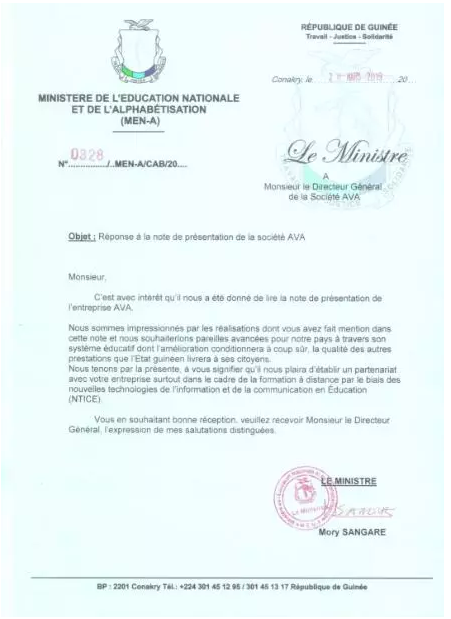幾內(nèi)亞政府教育與掃盲部部長(zhǎng)莫里桑加雷向奧威亞發(fā)出了官方邀請(qǐng),正式確定奧威亞為幾內(nèi)亞國(guó)家遠(yuǎn)程教育平臺(tái)建設(shè)唯一合作伙伴,并邀請(qǐng)上市公司、奧威亞商務(wù)、技術(shù)人員赴幾內(nèi)亞調(diào)研市場(chǎng)、探討需求、洽談意向性訂單,為進(jìn)一步全面搭建幾內(nèi)亞教育信息化系統(tǒng)開(kāi)展相關(guān)工作。