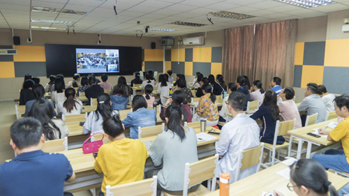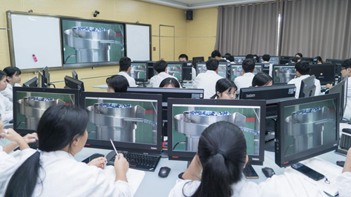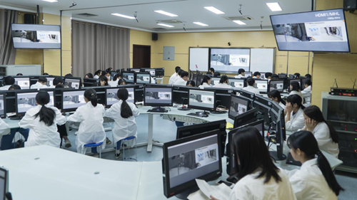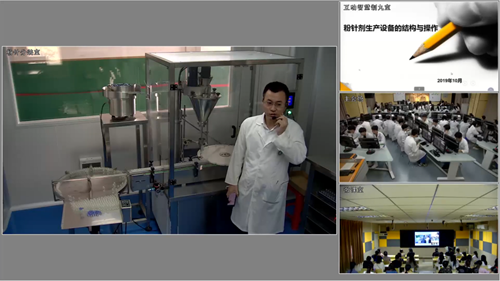 2019年10月31日,廣東省食品藥品職業(yè)技術(shù)學(xué)校的學(xué)生們像往常一樣進行實訓(xùn)課程教學(xué)。但與以往普遍職校實訓(xùn)教學(xué)不一樣的是,老師和少部分學(xué)生在實訓(xùn)室上課,大部分學(xué)生在智慧課室上課,老師在實訓(xùn)室對設(shè)備結(jié)構(gòu)和操作進行講解,學(xué)生在互動智慧課室通過座位前的屏幕觀看老師上課。聽課的老師們則在另外的觀課室對課程進行全程的觀摩。