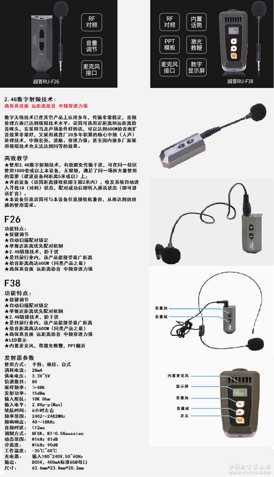 產品詳細介紹主要功能特點: ★使用2.4G數字射頻技術,有效避免傳輸干擾,同時使用1000套無竄頻,滿足同一場所大量使用的需要; ★開機自動進入配對狀態,配對成功后,自動轉入接收狀態; ★內置均衡器功能,使其音色更出色,聽感更舒適,中頻穿透力更強 ★麥克風拾音距離達到50CM ★話筒可以與任意主機配對使用; ★話筒具有功耗低的特點,充滿電可連續工作8小時以上; ★話筒采用充電式鋰電池 ★藍牙話筒開、關機均有提示音,且能調節話筒音量大小; 產品參數: ★接收頻率:2402 - 2482MHz(81信道) ★調制方法:GFSK ★配對方式:自動掃瞄、配對、鎖定,具備近距離優先連接機制 ★頻率響應:40 Hz ~18 KHz ★靈 敏 度:91±3 dB ★拾音距離:50CM ★輸出端子:平衡式輸出*1, 非平衡式輸出*1音量調節:暗調電位器 ★外觀尺寸:63.6mm*23.8mm*20.2mm;重量:約21.4G |
