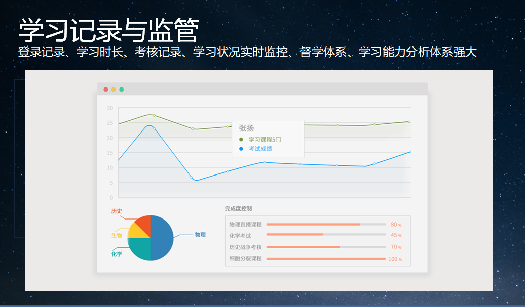 登錄記錄、學(xué)習(xí)時(shí)長(zhǎng)、考核記錄、學(xué)習(xí)狀況實(shí)時(shí)監(jiān)控、督學(xué)體系、學(xué)習(xí)能力分析體系。