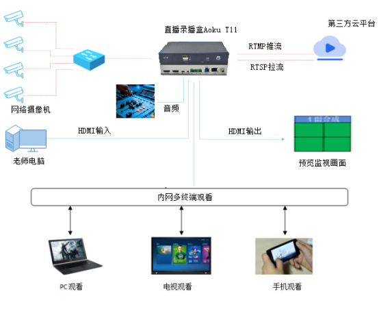 北極星通公司依托 15 年流媒體技術(shù)積累,推出Aoku T11 直播錄播盒: ✓ 極簡(jiǎn)部署:?jiǎn)闻_(tái) T11 直播錄播盒接入校園網(wǎng)絡(luò),即可實(shí)現(xiàn): 利舊現(xiàn)有網(wǎng)絡(luò)攝像機(jī) / 調(diào)音臺(tái)等設(shè)備,支持 1080P 60fps 高清編碼,自動(dòng)生成直播二維碼 / 鏈接,多終端同步觀看(支持 200 + 并發(fā)) ✓ 安全可控: 支持校園網(wǎng)內(nèi)外網(wǎng)隔離部署 ✓ 智能歸檔: 自動(dòng)生成標(biāo)準(zhǔn)格式視頻文件 支持按標(biāo)簽分類存儲(chǔ) 提供 API 接口對(duì)接校園資源平臺(tái) 典型應(yīng)用場(chǎng)景: ・專家講座:實(shí)時(shí)直播 + 在線互動(dòng) + 視頻存檔 ・精品課程:多機(jī)位錄制 + 智能剪輯 + 資源共享 ・大型活動(dòng):多會(huì)場(chǎng)聯(lián)動(dòng) + 在線投票 + 實(shí)時(shí)彈幕 ・應(yīng)急指揮:多路監(jiān)控畫(huà)面融合直播