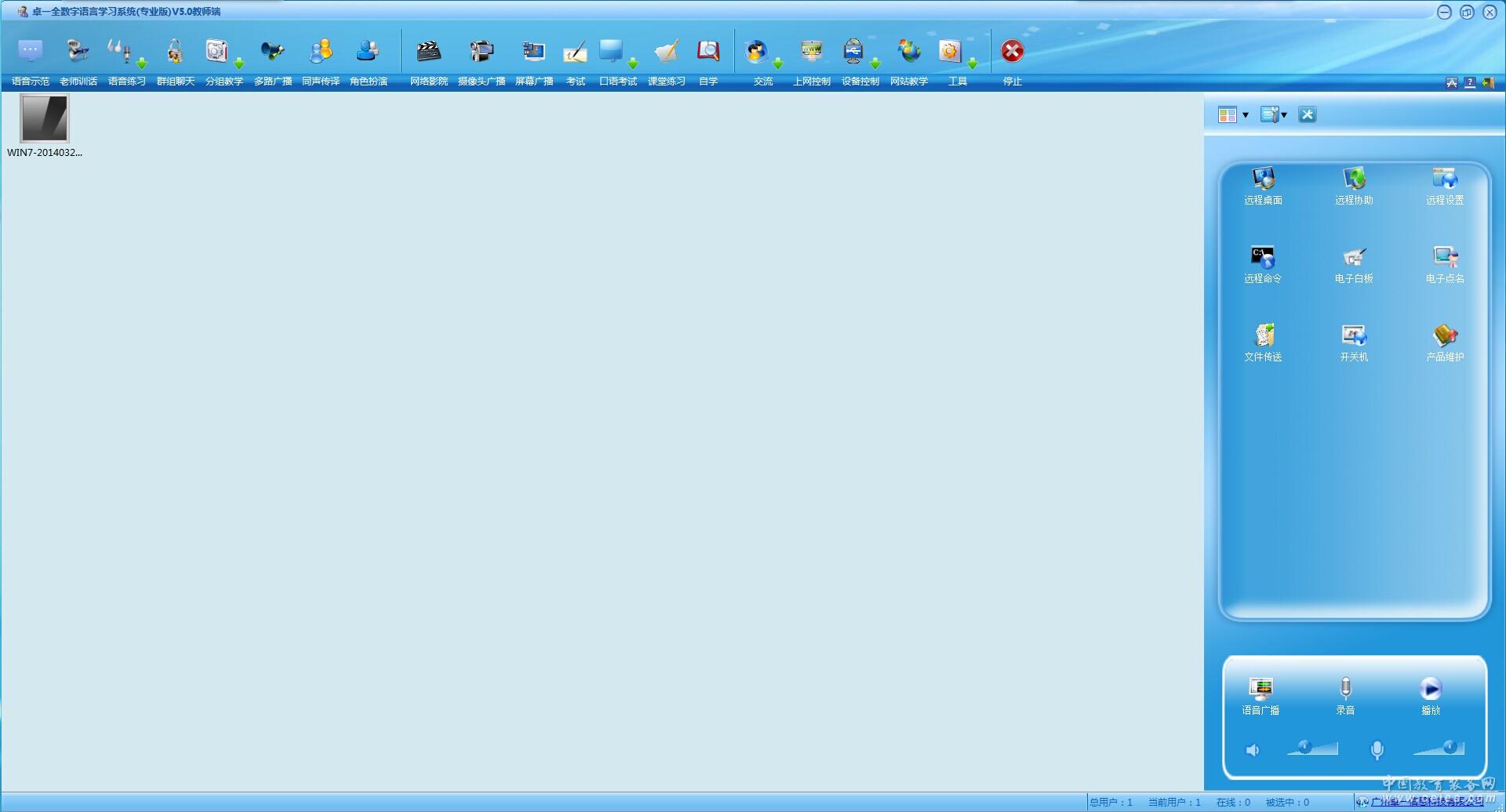 -------------------------------------------------------------------------------- 產品特點 語音示范 教師訓話 師生對講 指定發言 儲存聲音 復讀練習 語音比較 群組聊天 多路廣播 同聲傳譯 角色扮演 網絡影院 屏幕廣播 綜合考試 口語考試 課堂練習 上網控制 信息交流 網站教學 視頻教學 遠端登錄 遠端卸載 遠程桌面 遠程協助 遠程設置 遠程命令 電子白板 文件傳送 語音廣播 遠程維護 班級模型 學生轉播 指定上線 指定下線 顯示面板 隱藏面板 自主學習 定義模板 設備控制 |
