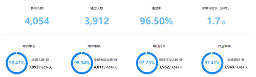 此次培訓獲得都安瑤族自治縣教育局高度重視以及全縣老師的積極響應(yīng),據(jù)悉,初階培訓參加人數(shù)共計4,054名。截止至2020年5月21日,初階培訓取得圓滿的成功,全縣教師累計學習時長共計1.7萬小時,培訓考核通過人數(shù)為3912人,考核成功率96.5%,此次培訓達到預(yù)定目標,基本實現(xiàn)老師能夠通過培訓掌握交互式課件制作的要求。