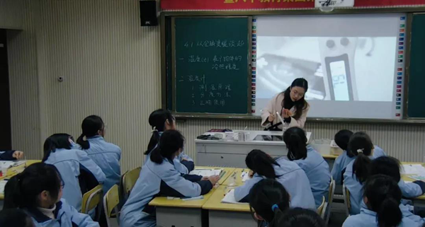 物理課上,徐老師利用希沃白板5手機端的攝像功能實時將實驗過程及結果同步與大屏中,全班同學一起見證物體溫度的變化。