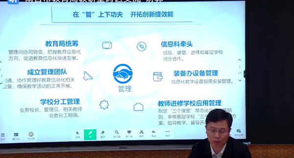 前郭縣王天昊主任從區(qū)域情況、方案設(shè)計、建管培用、取得成績四個方面介紹了前郭縣三個課堂的建設(shè)情況,指出“三個課堂”實現(xiàn)常態(tài)化應(yīng)用一方面需要城鄉(xiāng)一體化的硬件建設(shè),還需要在教師培訓上多下功夫,同時要明確各部門職責分工并制定考核評價體系。