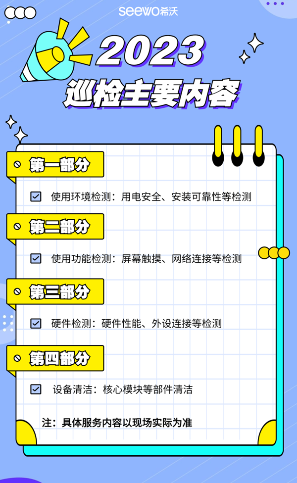 除了升級(jí)服務(wù)之外,本次巡檢活動(dòng)將繼續(xù)從設(shè)備保養(yǎng)、硬件服務(wù)、軟件服務(wù)、網(wǎng)點(diǎn)服務(wù)、增值服務(wù)五個(gè)維度對(duì)希沃設(shè)備進(jìn)行檢測(cè)和保養(yǎng),以標(biāo)準(zhǔn)化的巡檢保養(yǎng)處理流程,提供環(huán)境、功能、硬件和清潔等共17項(xiàng)檢測(cè),為師生教學(xué)體驗(yàn)保駕護(hù)航。