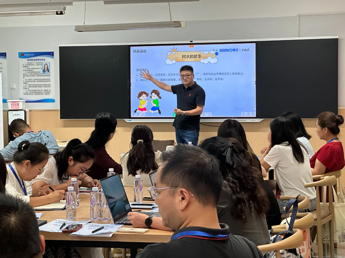 在培訓現場,希沃向與會觀眾展示了AI等新技術在“教、學、研、管、評”中的創(chuàng)新應用,并帶來了基于“AI+教育”應用的“未來一節(jié)課”,生動呈現一名教師基于希沃教學大模型下的課堂教學。