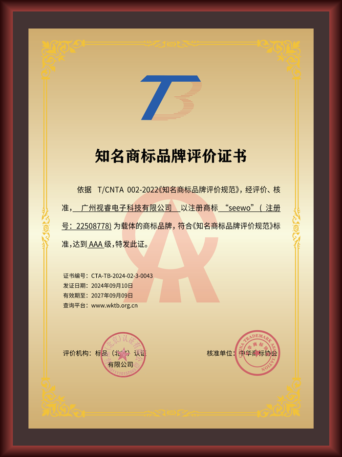 近日,中華商標協會公布了AAA級知名商標品牌評價公示信息,廣州視睿電子科技有限公司(希沃)的注冊商標“seewo”符合規范要求,通過AAA級知名商標品牌評價,入選成為具有國內外競爭力的AAA級知名商標品牌,這體現了對希沃品牌的高度認可。