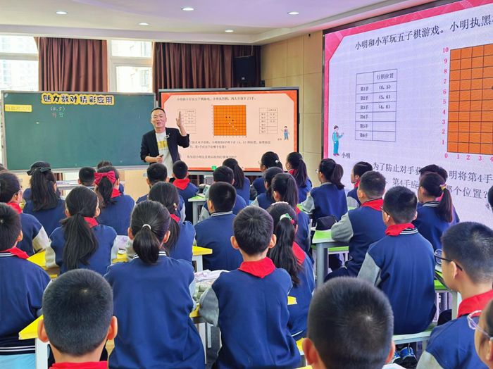 活動伊始,李能望與易鈴婕老師先后進行了《魅力數對精彩應用》與《停車位的秘密》展示課。其中,李能望老師通過繪制圖案、描述路線、行棋規劃等活動,學生不僅掌握了用數對表示平面上點的位置的方法,還懂得如何將這一方法應用于實際情境中,培養了他們的數學的應用能力和綜合素養。易鈴婕老師則通過擺、比、算等豐富的數學活動,讓學生感受到了數學與生活的密切聯系,增強了對數學的應用意識。兩位老師的精彩表現讓現場沉浸式感受到了兩位老師以及團隊的智慧與魅力,贏得了熱烈掌聲。