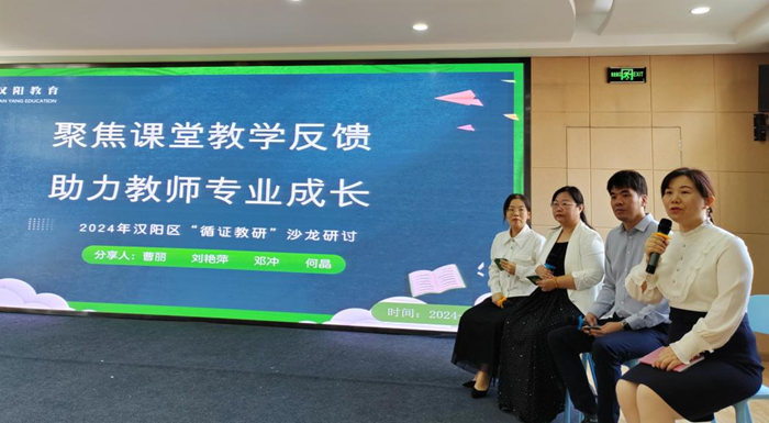 在現場觀課后,曹麗、劉艷萍、鄧沖、何晶組成的團隊圍繞漢陽區小學數學基于AI課堂反饋系統的教學設計、實施與評價進行沙龍研討,他們從自身角色角度與實際應用情況,帶領大家探索AI課堂反饋系統在教學中的應用新思路。