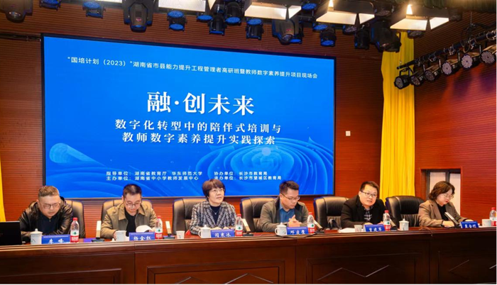 12月5日至6日,“國培計劃(2023)”湖南省市縣能力提升工程管理者高研班暨教師數字素養提升項目現場會在長沙市望城區中小學教師發展中心舉行。開班儀式由湖南省中小學教師發展中心副主任曾建軍主持。之后由分別由望城區教育局局長戴金利、湖南省教育廳教師工作與師范教育處三級調研員楊金紅致辭發言。在培訓環節,華東師范大學教師發展學院院長、全國中小學教師培訓專家工作組副組長、全國中小學教師信息技術應用能力提升工程辦副主任閆寒冰教授帶來了專題講座《數字化環境下的育人模式變革》。閆寒冰通過生動的案例和深入的剖析,闡述了數字化環境對教育教學模式的深刻影響,以及教師如何提升自身數字素養以適應這一變革,讓教師們深刻認識到生成式人工智能在教育教學中的無限可能。