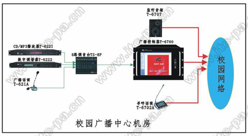 1. 在校園廣播室中放置了網(wǎng)絡(luò)控制主機(jī)、音源設(shè)備(CD/MP3機(jī),話筒,卡座等)、有源監(jiān)聽音箱等。