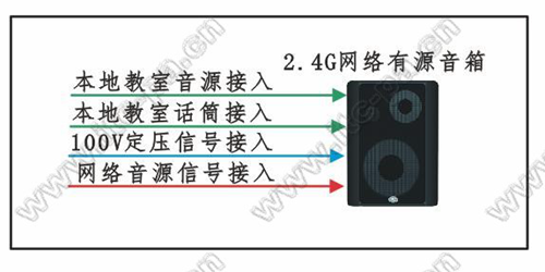 在教室中放置了2.4G網(wǎng)絡(luò)有源壁掛音箱(帶備份/MP3話筒),設(shè)備帶一路AUX輸入接口和一路MIC輸入接口(帶高低調(diào)節(jié)按鈕),可以接入本地話筒和本地音樂進(jìn)行播放;設(shè)備帶100V定壓備份,可以在斷網(wǎng)之后,自動切換到輸入定壓信號,實現(xiàn)雙線路冗余。