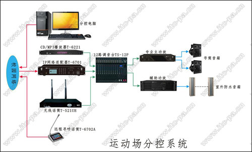 在運(yùn)動場做了分控中心,分控中心機(jī)房配置12路調(diào)音臺、CD/MP3播放器、專業(yè)擴(kuò)聲功放,遠(yuǎn)程尋呼話筒,IP網(wǎng)絡(luò)適配器和分控電腦,運(yùn)動場室外選用了號筒音箱(具有優(yōu)良的中高音表現(xiàn),聲壓級高,具有防水效果等)作為主擴(kuò)音箱,防水音柱作為輔助擴(kuò)聲音箱。