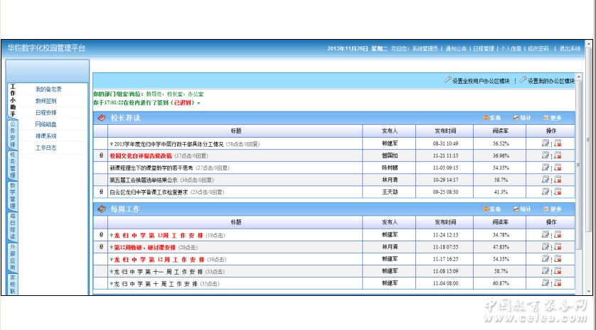 產品詳細介紹《數字校園綜合管理系統》是在仔細研究現代教育環境下教育信息化對學校管理模式改變的基礎上,在近10年的教育改革中提供大量的一線教育管理經驗,結合數百個學校大量的實踐經驗基礎上,開發出來的一套面向廣大中小學的集辦公、管理、公文處理為一體的自由組合軟件,致力于提高中小學信息化的發展。 系統針對辦公管理中的公文處理效率低、工作流程不明朗等事務繁多、信息傳輸量大的特點,強調了信息共享和利用,信息傳達及時,提高網絡協同辦公的能力。本軟件主要由平臺管理、家校聯系、留言管理、公務安排、每日薦讀等模塊組成,可實現學校精神引領、辦公提醒、及時交流等功能,提升學校各部門之間溝通的有效性,實現校園“無紙化,零電話”的高效率辦公,幫助中小學實現工作有序可控。 本系統所包含的模塊: 門戶網站 校園辦公自動化 資源平臺(含資源) 成績管理分析跟蹤 智能排課 學校論壇、教研 家校互動 教師日志 教師成長記錄 一站式登錄,統一用戶管理! 聯系人:張小姐 聯系電話:13811414490 QQ:2056317835 |