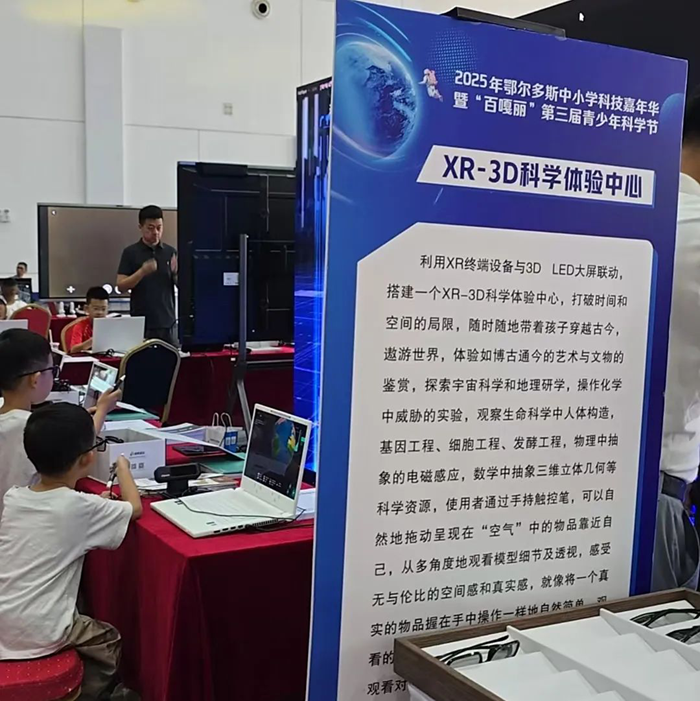 本屆科技節上,中教啟星搭建了 “XR-3D 科學體驗中心”,實現了科技融合教育應用的精彩呈現。該體驗中心以裸眼 3D 便攜終端為載體,搭載了小學科學、中學理化生史地學科資源,踐行 “做中學”“玩中學” 的教育理念,為培養青少年探索、協作、創新的能力提供了優質平臺。