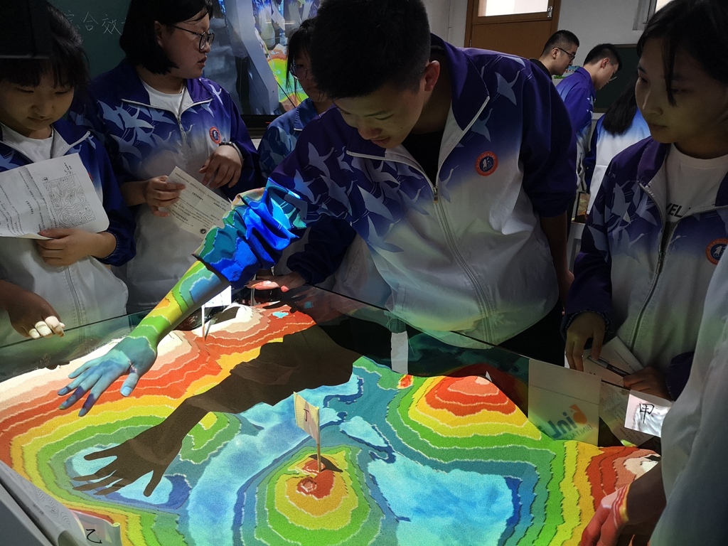 地理AR沙盤結合了計算機、投影機、體感追蹤設備,當學生在沙盤中堆砌沙子呈任意形態時,體感追蹤器會實時測量出下方沙子的高度,投影機會依據模型高度投射分層設色圖,進而演示不同地形地貌。隨著學生移動沙盤內的沙子,追蹤器捕捉其形態變化,投射的色彩和等高線也會發生相應的變化。