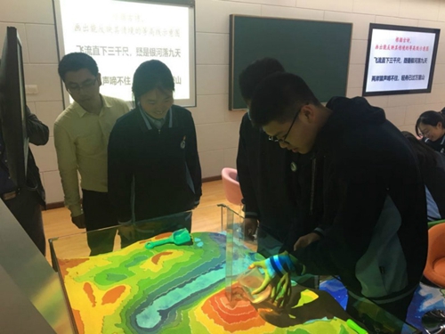 在上海師范大學附屬中學的數字化地理專用教室,一堂別開生面的地理課《等高線地形圖的判讀》正在進行。課上,趙禧琳老師請每個小組派出代表來到AR沙盤前,根據“飛流直下三千尺,疑是銀河落九天”“兩岸猿聲啼不住,輕舟已過萬重山”兩句古詩的情境,在沙盤上制作景觀模型。這個趣味任務一下子點燃了學生的熱情,學生在沙盤前討論、動手,在“玩”中探究二維等高線地形圖與三維地貌模型的關系。