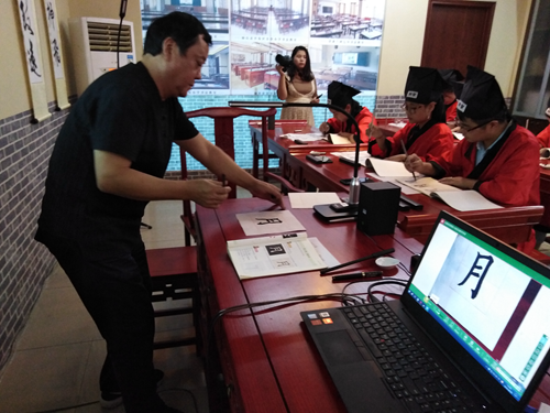 在武老師專業(yè)的書法示范教學和講解下,主課堂的學生與分會場的老師一同書寫。分會場的老師通過未來遠程書法系統(tǒng),可清晰地觀看武老師和學生書寫的全過程。