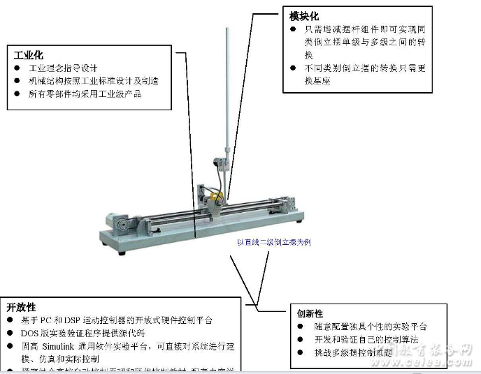 產品詳細介紹 | | 直線倒立擺是在直線運動模塊的基礎上,增加倒立擺組件,可以組成一級至四級的倒立擺,在驅動部件之間增加柔性彈簧部件,可以組成柔性一級至三級倒立擺。 |