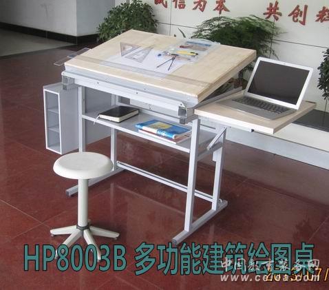 結構技術參數: 1)整體采用全鋼結構,標配主桌面采用厚度2.5cm的90×60cmE1環保楓木色三聚氰胺板桌面基板; 2)主桌面下雙側采用“惠普”繪圖專用傾角調節鉸鏈,經久耐用,保證桌面平整、同步控制調節傾斜度調節0-80°;桌面板下端筆槽邊高出桌面折邊可擋住0、1、2號繪圖板或者丁字尺等物品; 3)桌子右邊采用“惠普”專利折疊結構的副桌面板(E1國標的25mm三聚氰胺板400×550mm),滿足教學和繪圖作業配套放置電腦、文具、書籍等需求;不使用時可以下掛節省空間; 4)桌體右邊設置有掛鉤,可以掛放書包等物品; 5)桌子左側帶有三格圖紙鋼板筒架(600×120×400mm); 6)主桌面下面和支架中部配置有二處鋼制儲物廂,可以放置書包、文具等; 7)桌腿支架底部采用塑膠木調整螺絲,便于調節水平等功能,保證整體結構的堅固、穩定;