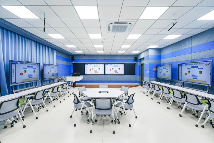 基于東營職業(yè)學(xué)院師生開展分組教學(xué)、主題研討、協(xié)作共創(chuàng)等教學(xué)活動(dòng)需求,海信商用顯示還助力其打造10余間研討型智慧教室。