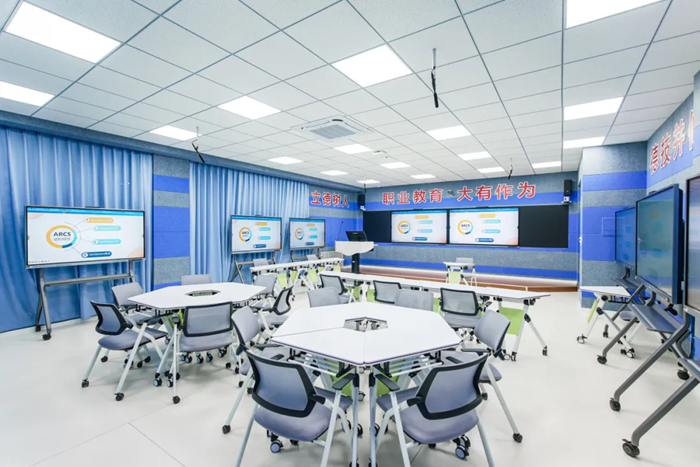 為滿足場景化管控、教學(xué)互動(dòng)、沉浸視聽、線上教學(xué)等場景需求,東營職業(yè)學(xué)院共打造40余間標(biāo)準(zhǔn)型智慧教室,創(chuàng)新教學(xué)模式,提升教學(xué)效率與課堂體驗(yàn)。