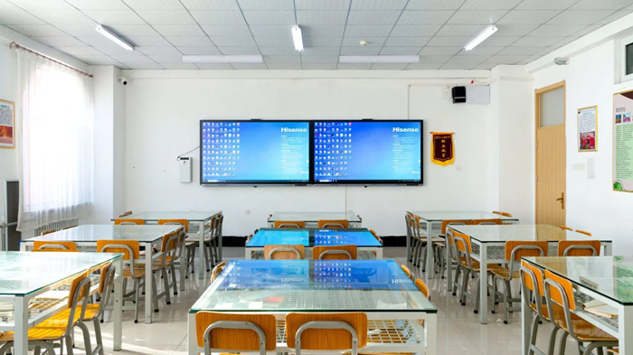 海信商用顯示助力河北外國語學院打造777間以雙屏智慧黑板為核心的智慧教室,集成智能監控、人臉識別系統,實現教學互動、設備管控,支持線上線下融合的教學模式,賦能教學場景的數字化轉型。