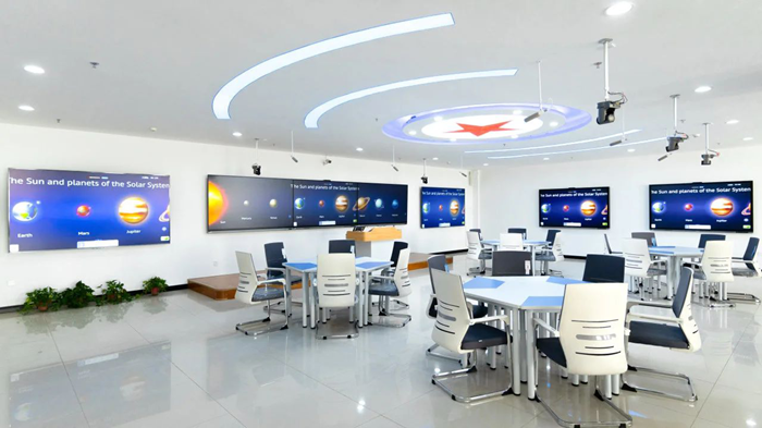 河北外國語學院始建于1998年,目前開設語種數量位居中國高校第二位,世界私立大學第一位。學校占地2600畝,是一所擁有139棟大型樓宇的“世界公園型校園”。校園面積大、開設課程種類多,這對校園設備的兼容性與場景適配性提出極高要求。海信商用顯示憑借“全品類、全場景”的顯示解決方案能力,為學校量身打造三大核心場景: