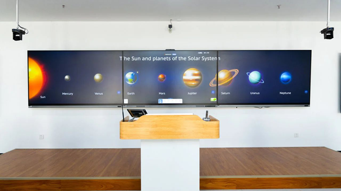 依托海信商用顯示領先的智慧教育解決方案,河北外國語學院還落地了以三聯屏智慧黑板+精品錄播系統為核心的精品錄播教室。通過多屏聯動、4K高清錄制、AI自動追蹤等技術,簡化國家級精品課程制作流程,助力優質教育資源的沉淀。