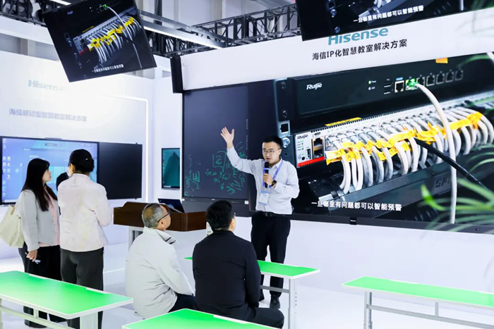 在傳統(tǒng)智慧教室中,設(shè)備疊加帶來高成本、系統(tǒng)架構(gòu)復雜難管理、多品牌應(yīng)用割裂影響體驗、故障頻發(fā)維護困難,成為普遍存在的四大痛點。海信商用顯示精準洞察上述問題,緊抓數(shù)智融合趨勢,于展會現(xiàn)場重點展示了IP化智慧教室解決方案。