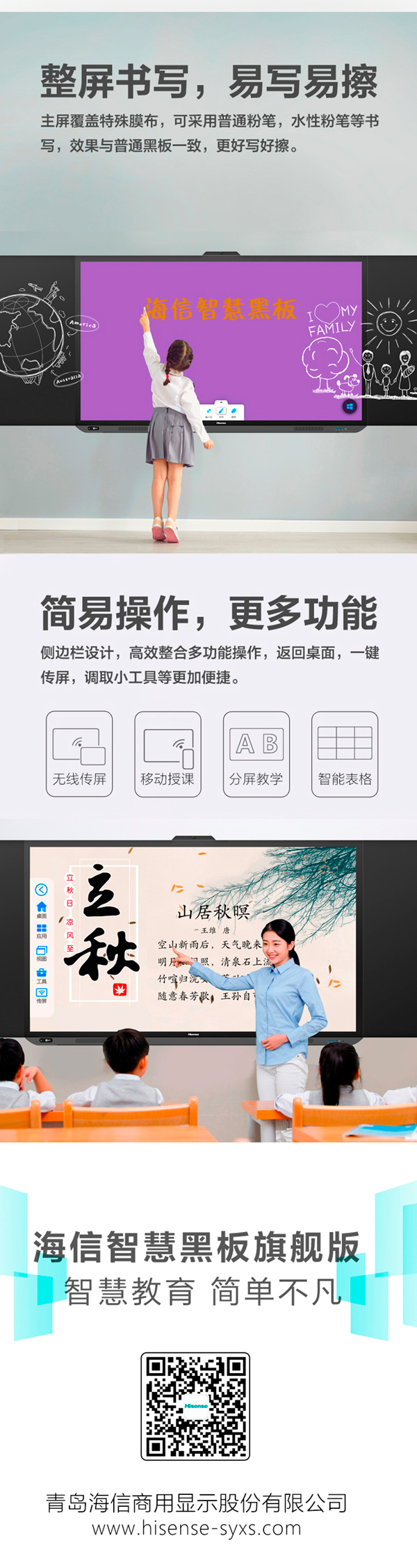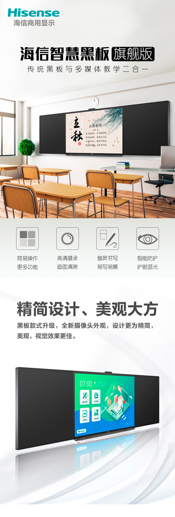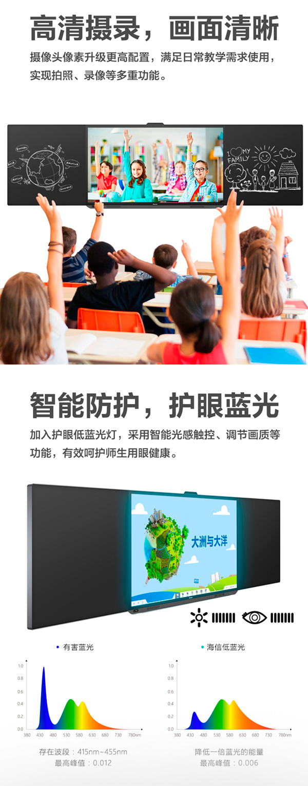 海信智慧黑板旗艦版WZ系列將傳統黑板與觸控顯示一體化深度融合,粉筆書寫配合人性化 觸控操作,打造全新的教學環境,為師生打造互動式課堂。主屏表面高分子納米覆膜,粉筆書寫效果與副 板完全一致,使主屏不僅可以顯示,更能夠實 現黑板的書寫。全貼合工藝,降低光線經過不同介質的反射與 折射,減少師生觀看視覺偏差,擴寬可視角。教室通過“一卡通“”人臉身份證”管理設備權限, 防止無關人員肆意操作,保障設備與信息安全在軟件上采用多重護眼技術,降低有害藍 光能量,呵護師生視力,緩解視疲勞。全流程教學數據一站式融通,實現高效互動課堂。OPS電腦和接口全部下置,設計更精巧,使 用更輕松,維護更方便。
