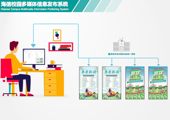 海信校園多媒體信息發布系統,為用戶提供校園信息文化,節目制作發布平臺。平臺可進行校 園多媒體統一發布信息,文本,節目終端發送,統一管理,為構建校園文化信息展示助力。系統部署方便,快捷,通過網頁或移動端即可登錄操 作使用,讓管理不再局限。持對不同類型素材上傳,對圖片、視頻、音樂等進行分類 管理,滿足學校個性化宣傳需求。上傳,下載采用先進技術,支持超大、超高清視頻穩 定上傳和下載,為使用者帶來便利,節省時間。所有操作都可通過靜默采集,直接形成可視化數據報表, 利于管理者分析統計數據。