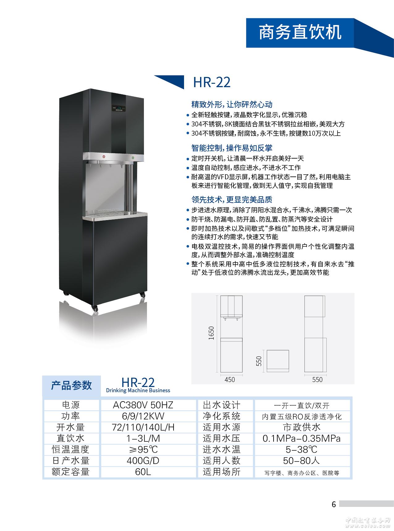 產品詳細介紹校園直飲水 泉升HR系列 額定電壓:220-380V 額定功率:3-12KW 尺寸:50*50*165cm 凈化系統:400-800G反滲透凈化系統,內置6-11G壓力桶